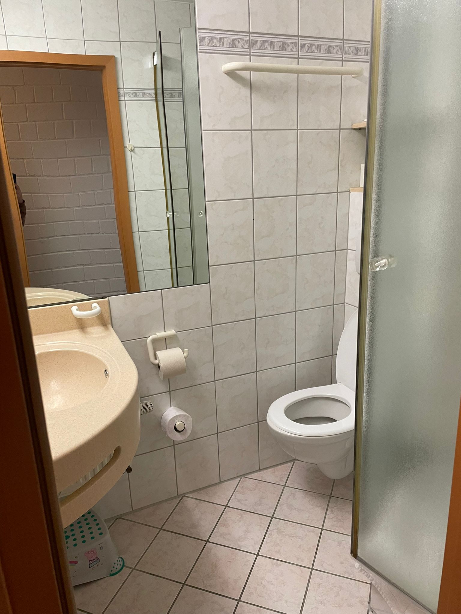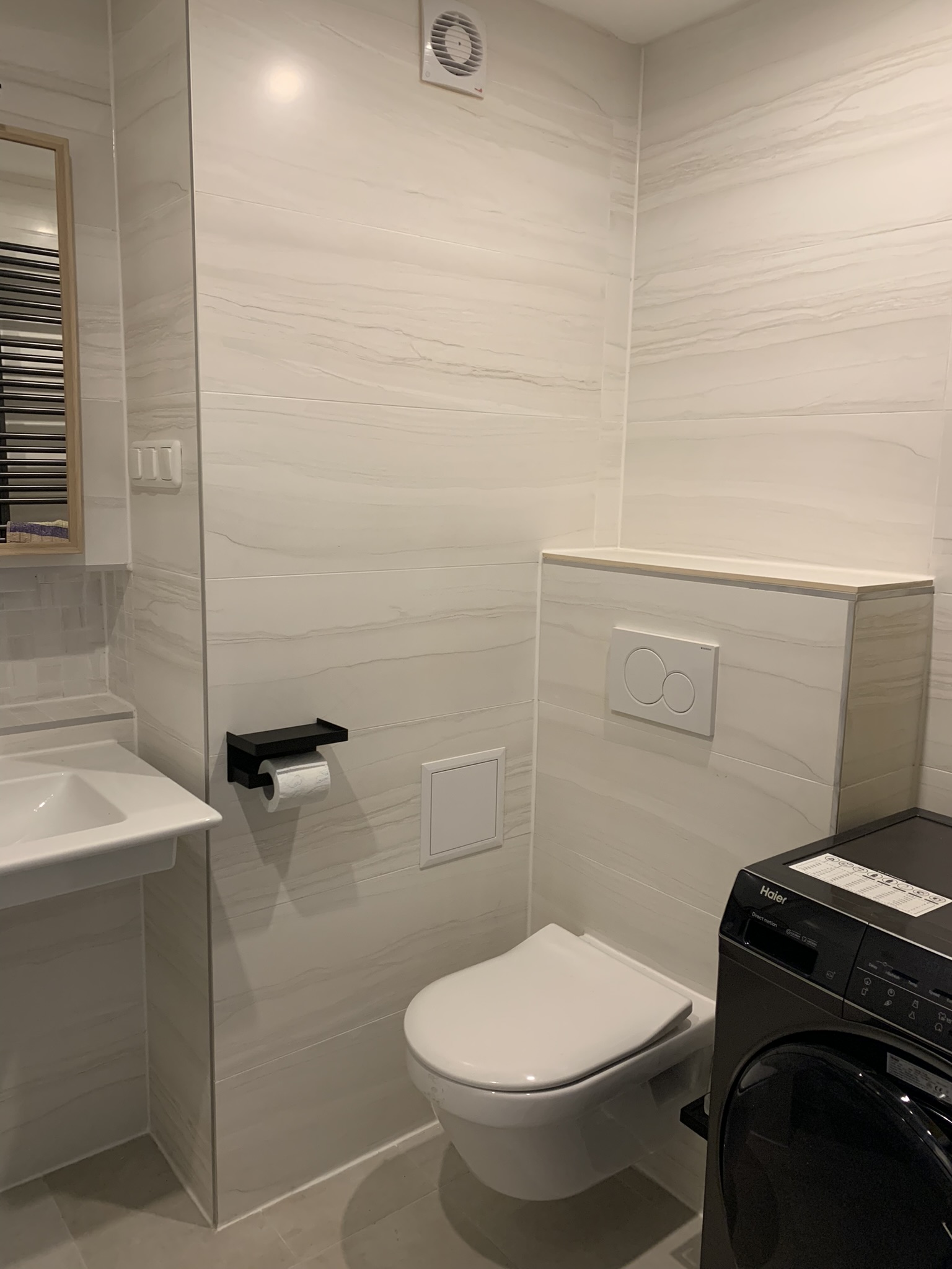 Koupelna je vybavena sprchovým koutem a součástí je i plně funkční pračka.